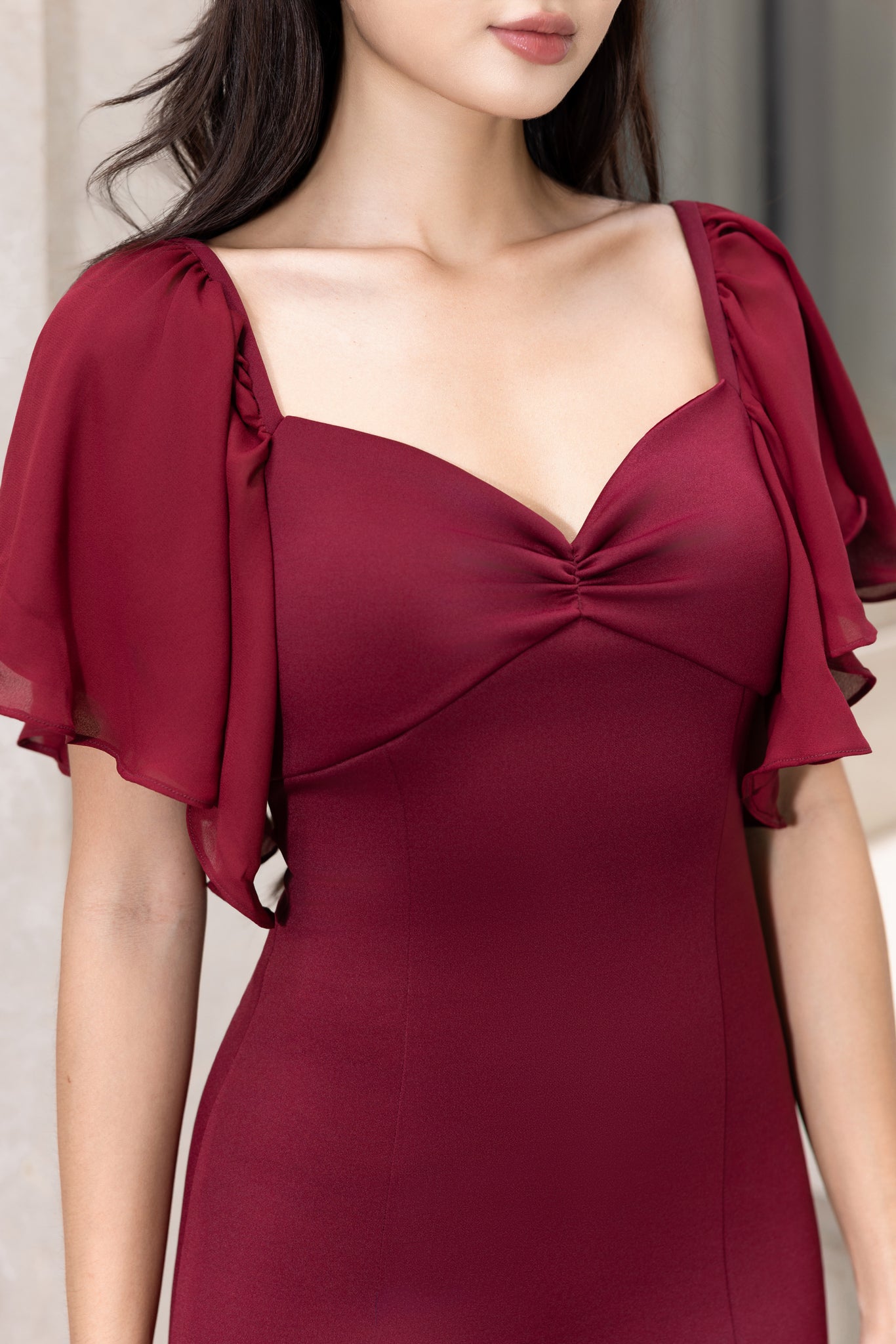 Features: Invisible back zipper | Padded | Flutter sleeves | Thigh slit
